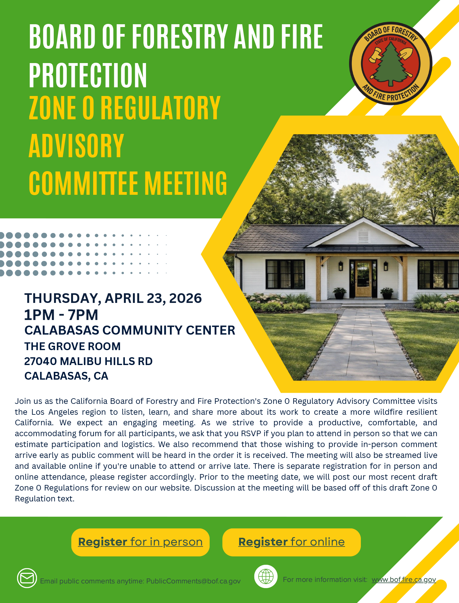 Register to join the California Board of Forestry and Fire Protection’s Zone 0 Regulatory Advisory Committee right here in Calabasas.