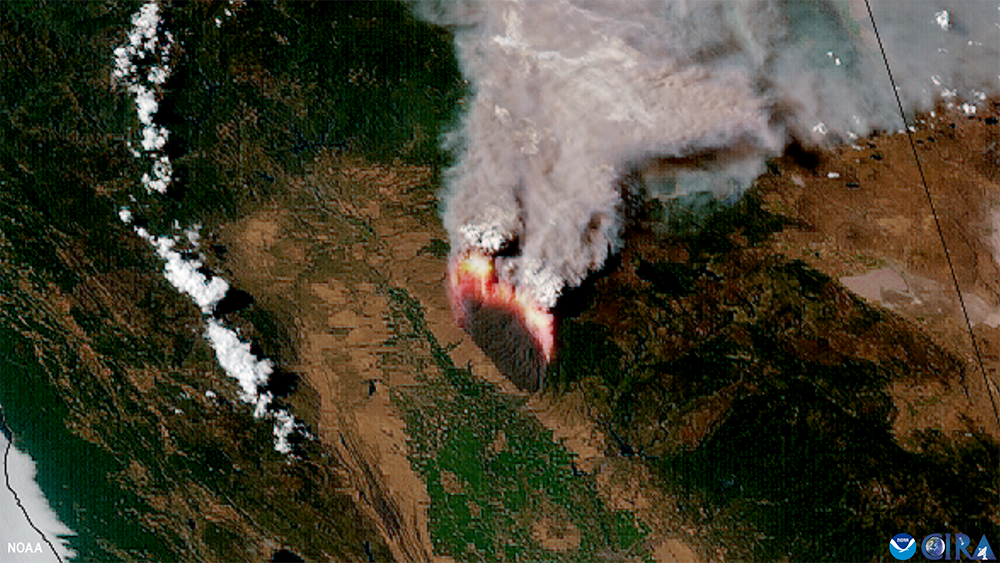 An image of California’s Park Fire and smoke taken from space by NOAA’s GOES-18 satellite on July 26, 2024.