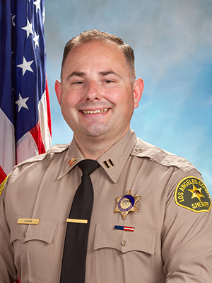 Captain Dustin Carr was hired by the Sheriff’s Department in 2007 and was initially assigned to the Pitchess Detention Center East Facility. Since then, he has worked at the Lancaster Station and the Custody Training and Standards Bureau. In 2016, Captain Carr was promoted to sergeant and then to lieutenant in 2021. As a lieutenant, he took on various roles, including patrol lieutenant, liaison to the unincorporated areas and Malibu, and for the past three years, he has served as the operations lieutenant. In August 2025, Captain Carr was promoted to captain and continued his service at the Malibu/Lost Hills Station.